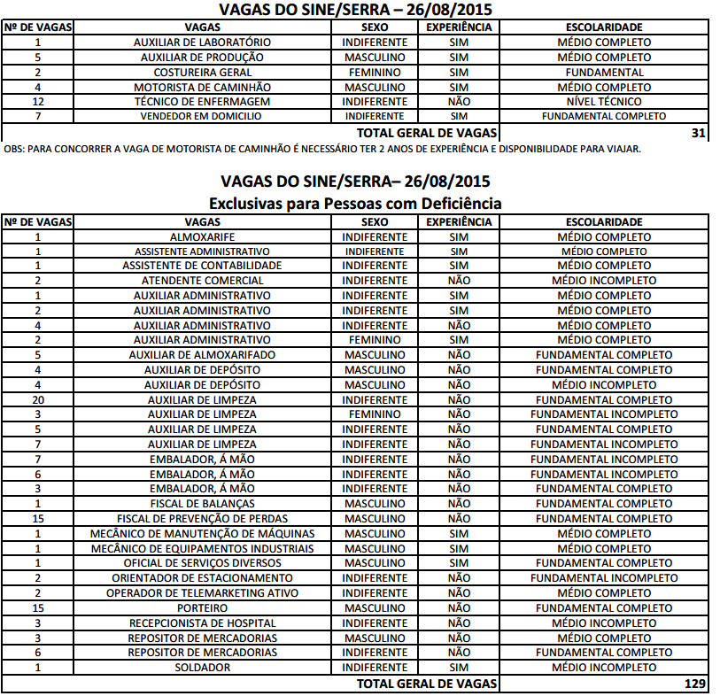 O Sine da Serra está oferecendo 160 vagas de emprego nesta quarta-feira (26), sendo 129 oportunidades destinadas a pessoas com deficiência (PCD). Entre essas chances, há oportunidades para auxiliar de limpeza (32), auxiliar de produção (20), fiscal de prevenção de perdas (15) e outras profissões.