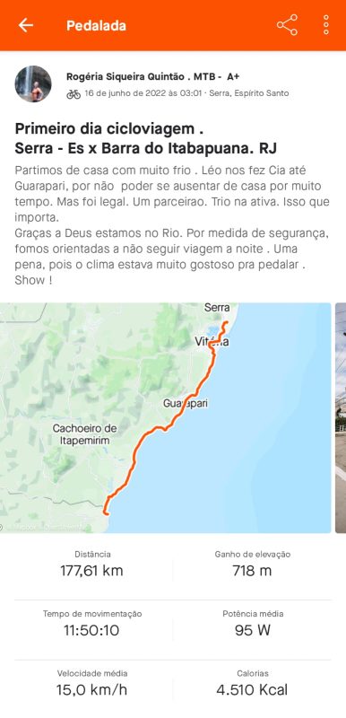 “Além de ser um desafio pessoal, nessa viagem de bike, fui agradecer pela saúde de três pessoas amigas, que estão passando por uma fase delicada, e também agradecer por minha, nossa vida. Depois desses dois anos de pandemia, estar aqui viva, pedalando, só gratidão”, disse Rogéria.