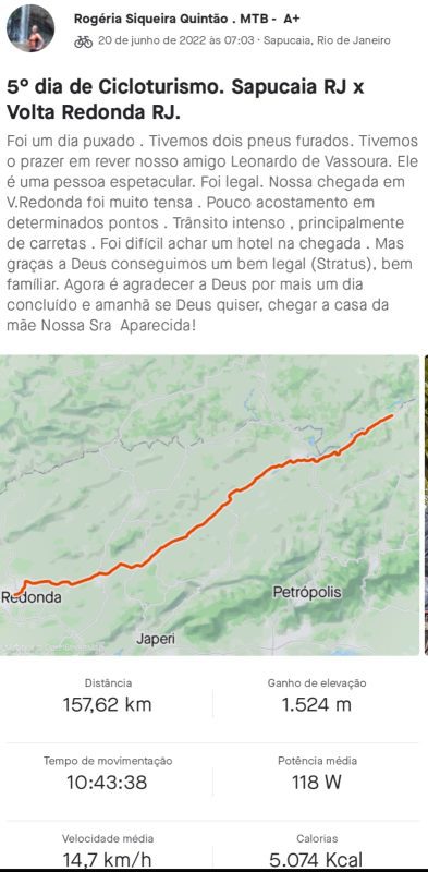 Rogéria vai completar 58 anos no próximo dia 06 e disse que o objetivo também foi pedir interseção divina para a sociedade de maneira geral. “Esse pedal foi para agradecer e invocar a Nossa Senhora Aparecida que interceda por toda a população nesses tempos difíceis. Graças a Deus tivemos a graça de chegar ao Santuário após 6 dias de aventuras. É algo indescritível. Emocionante!”, disse a ciclista.