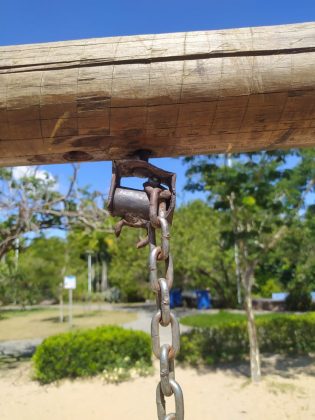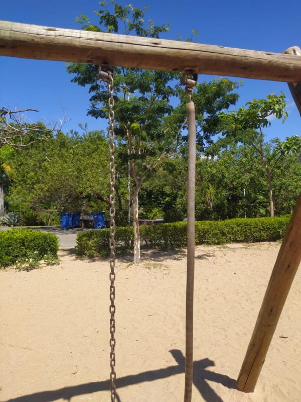 “Tem muitas crianças nos fins de semana, e muitos brinquedos estão avariados. É o exemplo do balanço que foram feitas umas amarrações com as correntes que me parecem muito frágeis. Com certeza não suporta uma criança mais pesada. Outra questão é a corda do escorregador central, está toda rasgada. Por fim, a Prefeitura retirou a gangorra e deixou apenas os tocos. Vejo muitas crianças subindo nesses tocos já que não tem gangorra”, disse Camila.