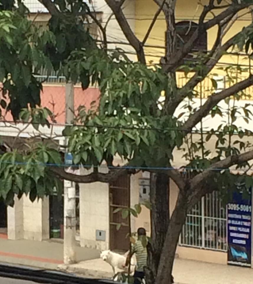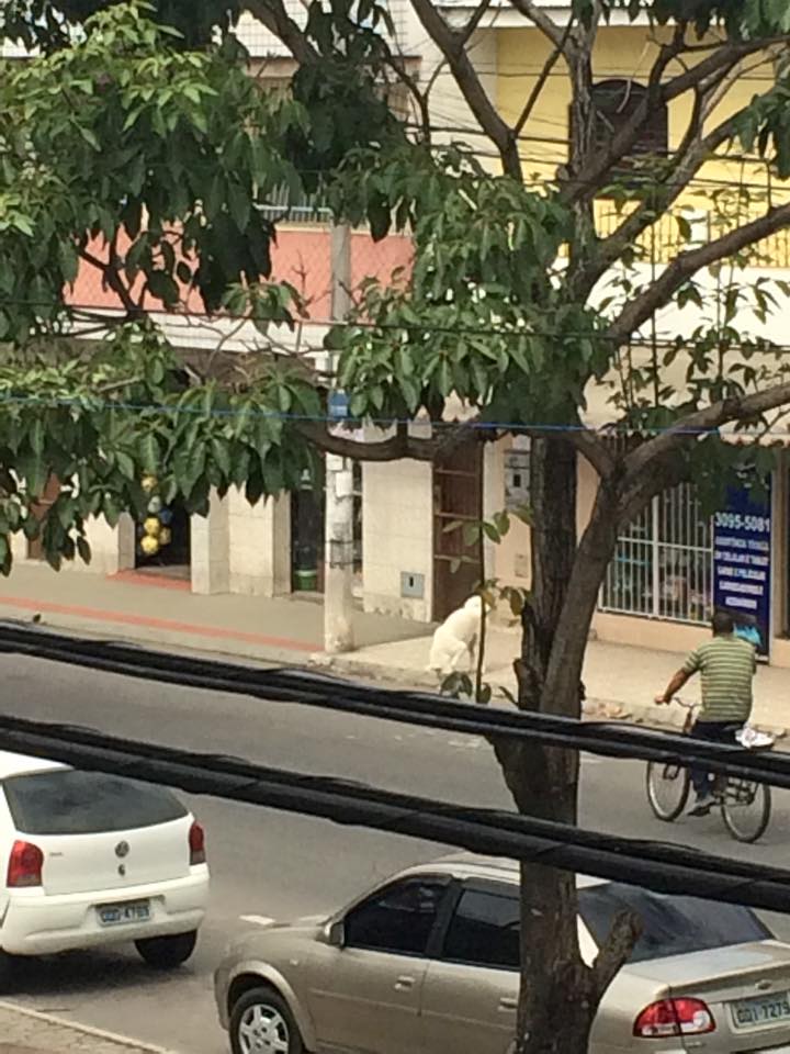 Ele é branco. A pessoa que tirou a foto não pode resgatá-lo pois está no trabalho.