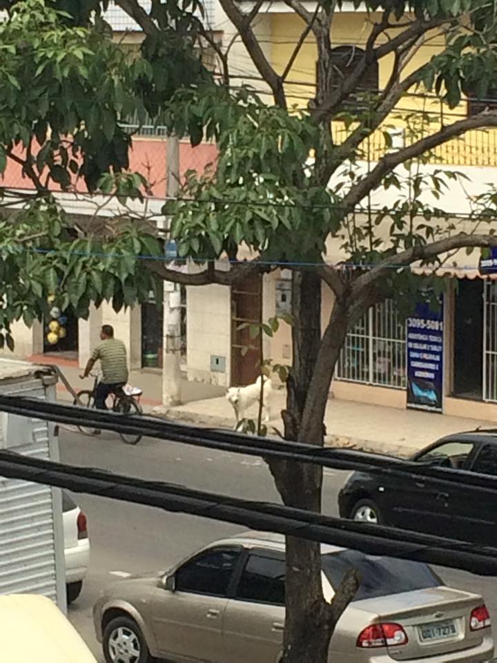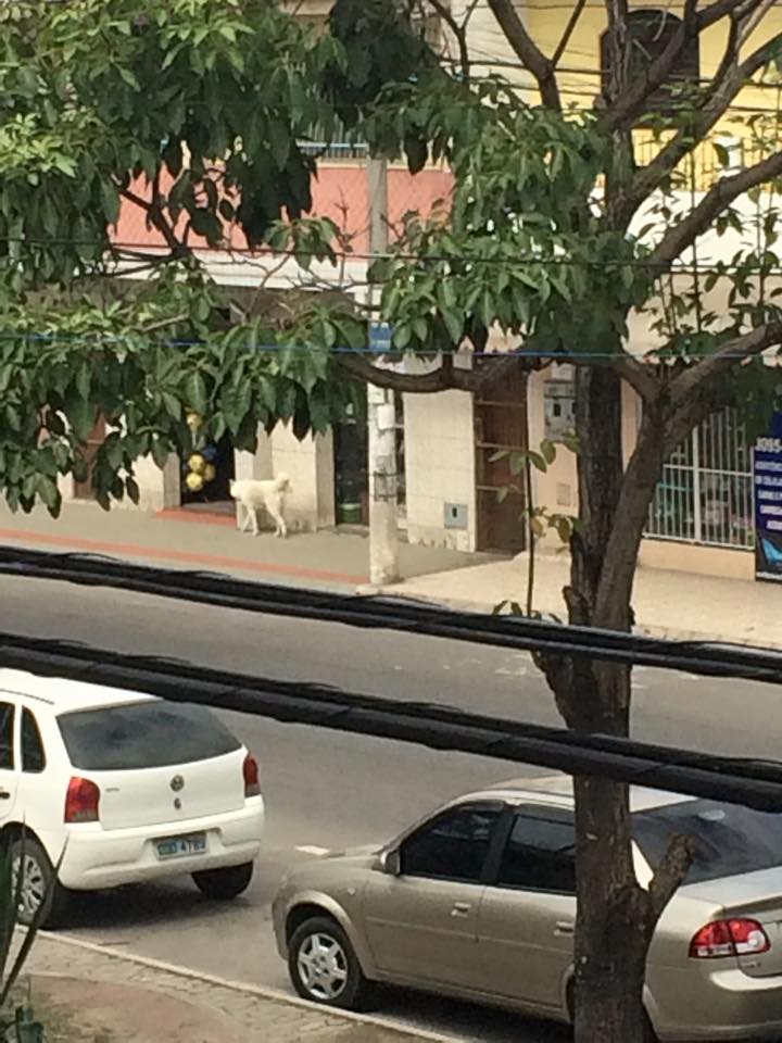 O objetivo é encontrar o dono. O cachorro está com cara de perdido, até sentou e ficou olhando para os lados.