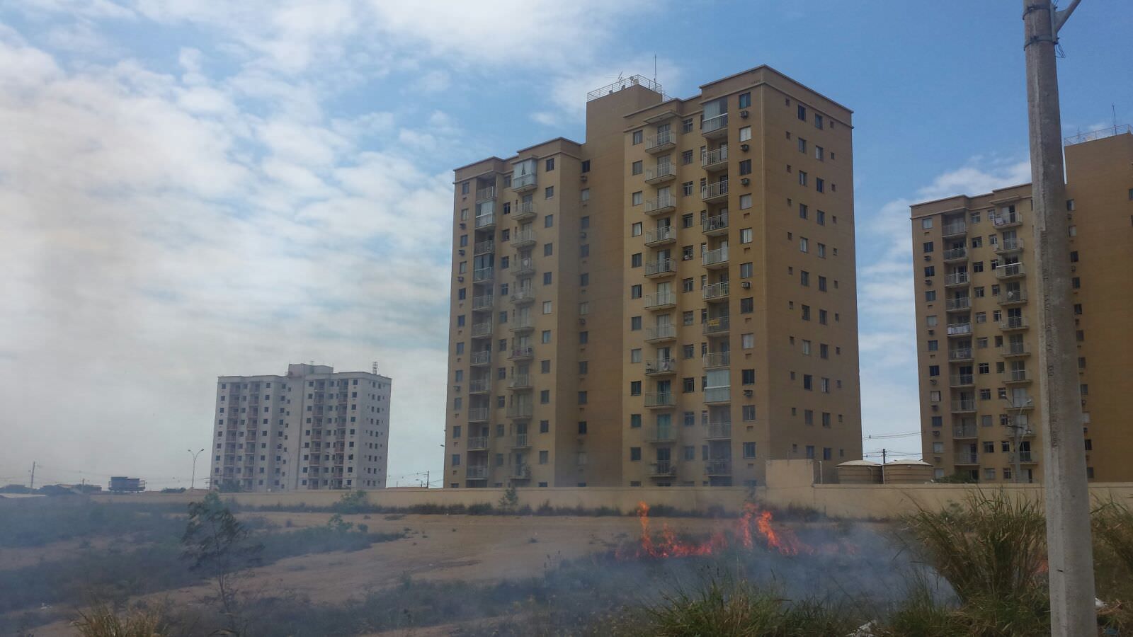 Apesar do terreno ser separado da mata por um rua, o fogo chegou à floresta por volta de 12h e há risco de atingir as casas do condomínio Campos Verdes, caso não seja controlado.