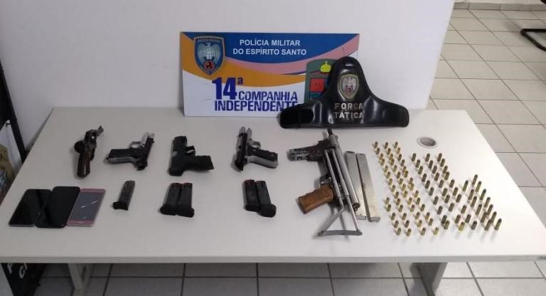 Com eles, foram apreendidas três pistolas e um revólver, além de farta munição dos calibres das armas apreendidas (a lista de armas e munições apreendidas está no final dessa matéria). Por fim, os policiais entregaram a ocorrência para a Delegacia de Homicídios e Proteção à Pessoa, em Barro Vermelho, Vitória, onde o crime será investigado. Todos os cinco homens estão detidos.
