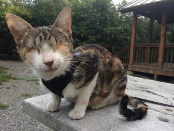 Esta é a Honey Bee. Uma gatinha completamente cega que vive muito bem sem este sentido. Ela é uma gatinha muito linda e aventureira. Acredite, se quiser, ela adora fazer trilhas com a família.