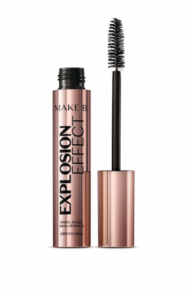 O destaque de lançamento se dá com a Make B. Explosion Effect, com nanoácido hialurônico, que define e torna os fios mais espessos. A máscara entrega 999% mais volume, 300% mais curvatura, 400% mais alongamento. Com 11h de duração, é resistente – não transfere, não escorre, nem borra –, mas tem fácil remoção com água morna.