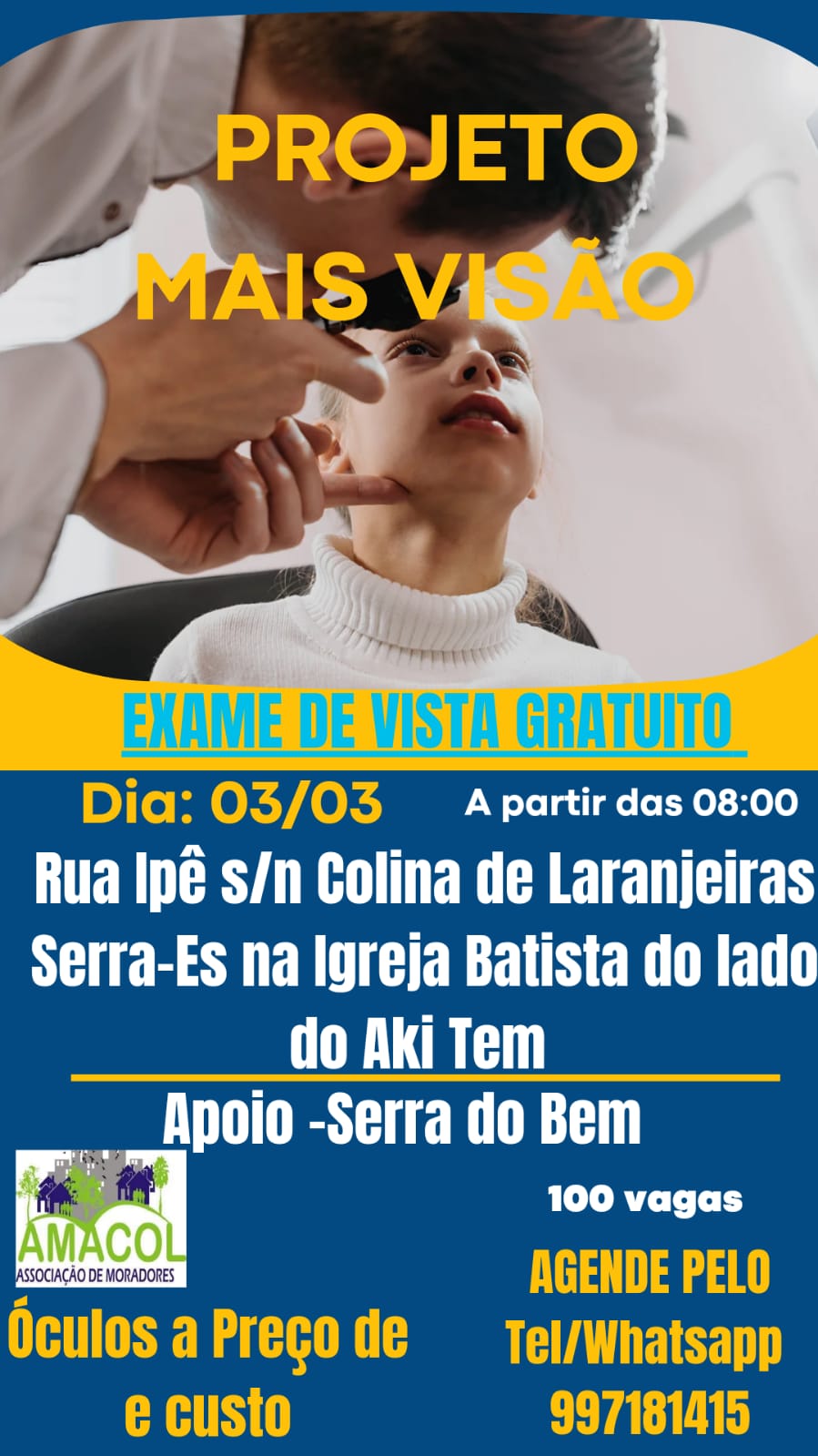 Nesta sexta-feira (03) o projeto Mais Visão vai promover uma ação para os moradores mais carentes de exame de vista na Serra. A agenda será em Colina de Laranjeiras, e há vagas para atender 100 pessoas.