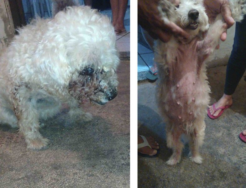 Lilica e Macarrão apresentavam sinais de maus tratos. Lilica cheia de tumores e Macarrão com míiase (bichos) em um de seus olhos.