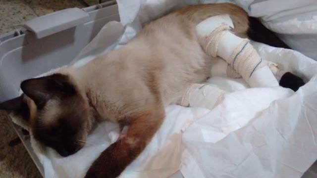 Essa gatinha caiu do telhado do 4° andar e quebrou às três patas. Foi levada a clínica Univet, em Jardim Camburi, mas o valor ainda esta alto e a responsável pede ajuda para custeio dos procedimentos.