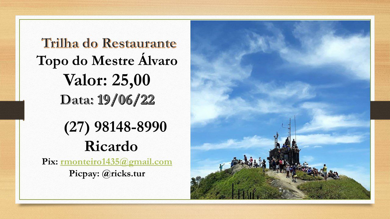 Informações pelo telefone 27 98148-8990. O pagamento pode ser feito via Picpay @ricks.tur ou pelo Pix que é o email rmonteiro1435@gmail.com.