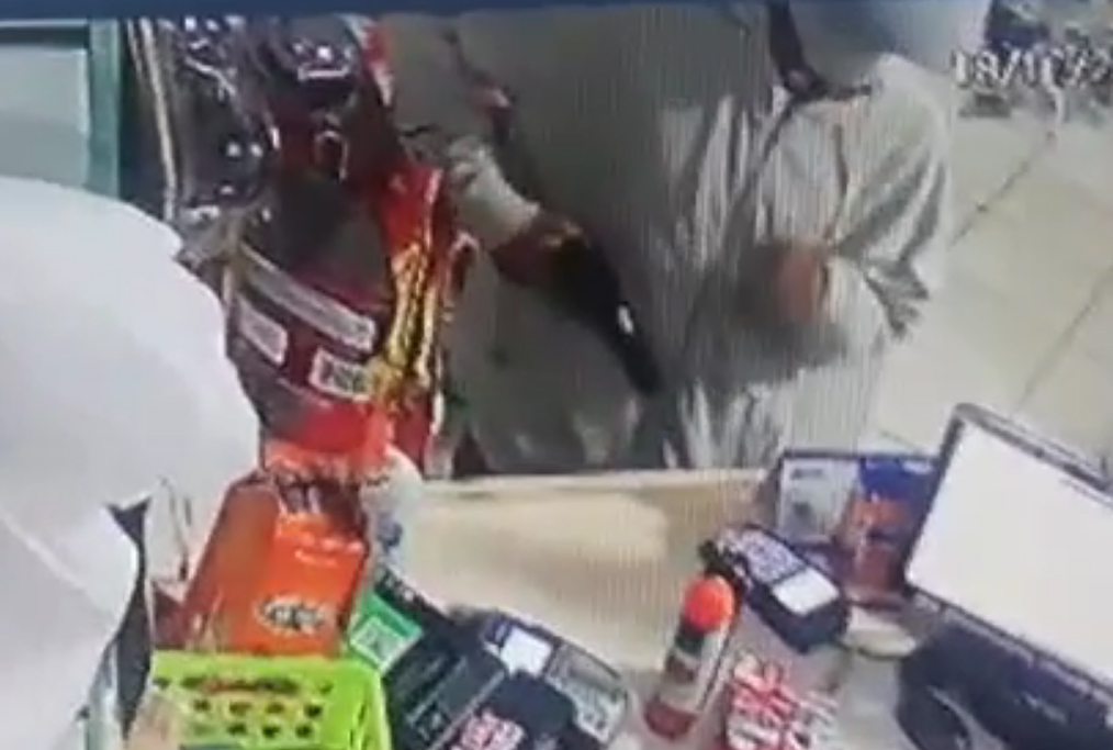 O vídeo mostra o homem armado, de máscara branca, entrando tranquilamente na farmácia, e fazendo a limpa no caixa do estabelecimento comercial.