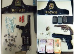 Em Jardim Carapina, por volta das 16 horas, na avenida Presidente Dutra uma equipe encontrou uma arma de fabricação caseira calibre 12, com capacidade para seis disparos, e carregada com cinco munições intactas do mesmo calibre, 28 pinos de cocaína, 19 buchas de maconha. Ninguém foi detido.