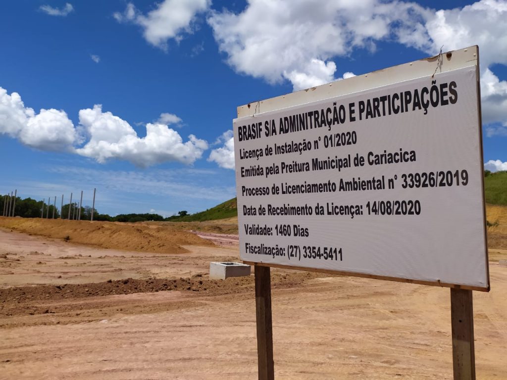A placa indica que há a Licença de Instalação nº 01/2020 expedida pela Secretaria Municipal e Desenvolvimento e de Meio Ambiente da Prefeitura de Cariacica (Semdec). Informa também que a validade da licença é de 1.460 dias.