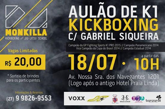 Se você é amante de esporte e gosta de artes marciais, sábado (18) é um dia para se animar. Praticante ou não, em Jacaraípe, terá um aulão de K1 – Kickboxing, organizado e liderado pelo campeão serrano, Gabriel Siqueira. O evento acontece na Av. Nossa Senhora dos Navegantes, nº 1201, após o antigo Hotel Praia Linda.
