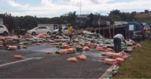 Um caminhão carregado de refrigerantes tombou, na manhã deste domingo (23), em trecho da BR-101,...