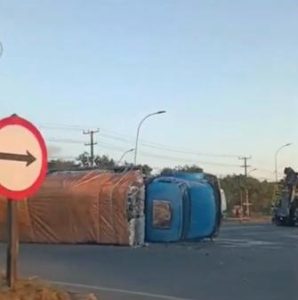 Um caminhão que carregava materiais recicláveis tombou na altura do bairro Barcelona, na Serra, na...