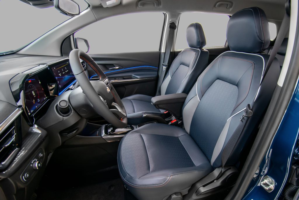 O interior chama bastante atenção, com um novo painel que traz a sensação de ser uma tela única. O painel de instrumentos é digital e integra a central multimídia em uma só peça. Além dessas mudanças, a Spin ganhou muitos porta-objetos espalhados pelo carro.