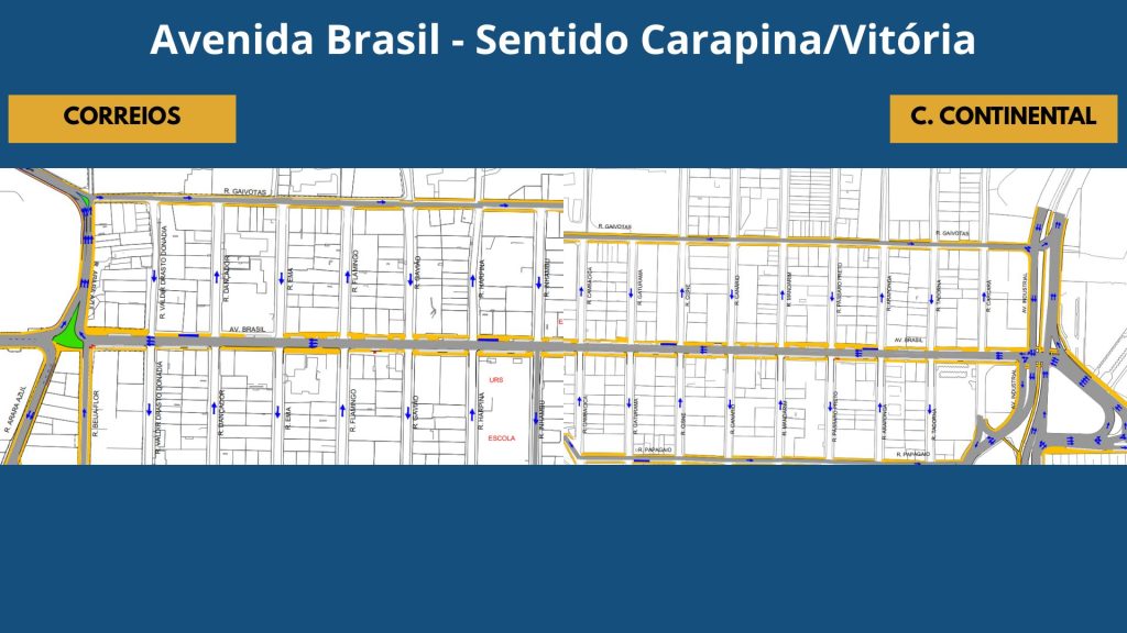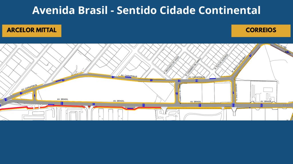 A partir do entroncamento com a Avenida Brigadeiro Eduardo Gomes (Trevo de acesso à portaria da ArcelorMittal), a circulação na Avenida Brasil será no sentido Cidade Continental até a Rua Arara Azul, nas proximidades dos Correios. Nesse ponto, o condutor poderá seguir à direita na Rua Arara Azul e depois à esquerda na Rua Papagaio, ou então virar à esquerda na Rua Arara Azul e, em seguida, à direita na Rua Gaivota. Tanto a Rua Papagaio quanto a Rua Gaivotas passarão a ter mão única no sentido Praias.