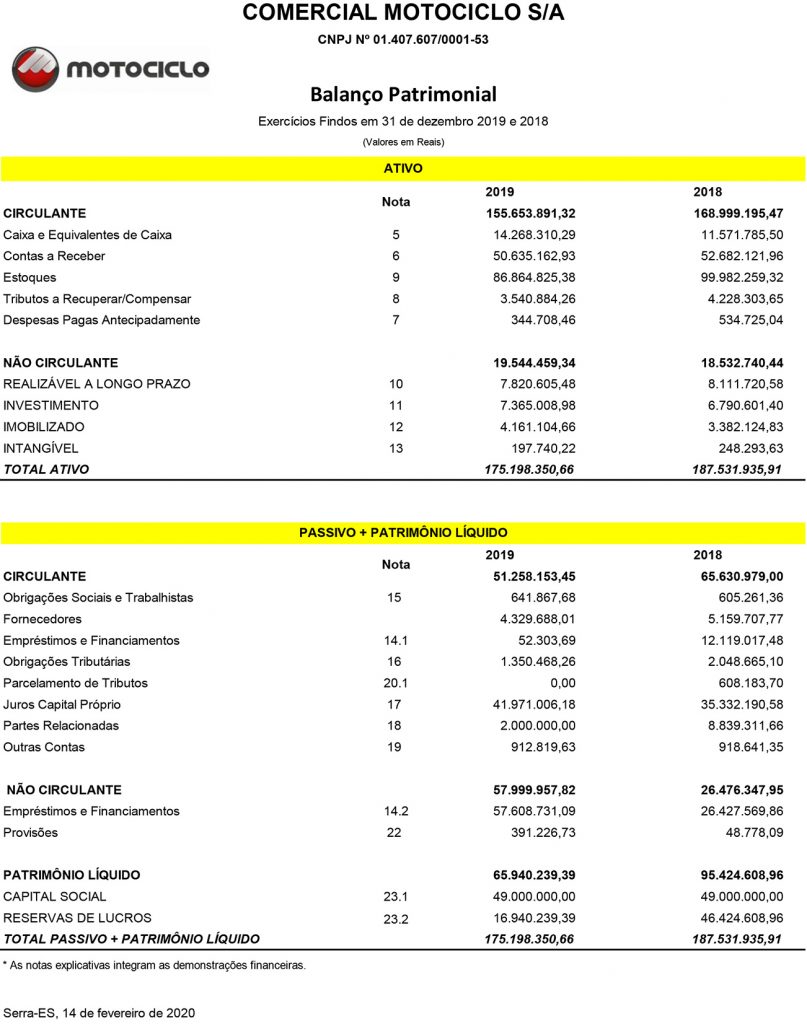 Balanço Patrimonial – COMERCIAL MOTOCICLO S/A – CNPJ Nº 01.407.607/0001-53