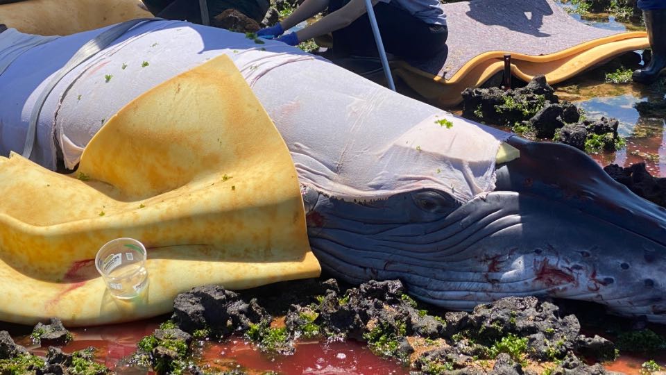 Uma baleia — da espécie jubarte — encalhou na praia de Manguinhos, na Serra. O animal foi encontrado ferido por moradores na manhã deste domingo (17).