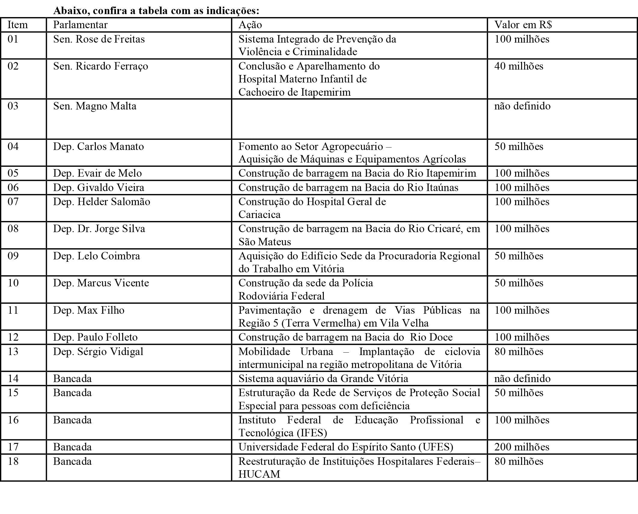 Os valores foram definidos em reunião da bancada federal, em Brasília, que contou com a participação dos senadores Rose de Freitas e Ricardo Ferraço (ambos PMDB); dos deputados Carlos Manato (SD), Evair de Melo (PV), Givaldo Vieira (PT), Jorge Silva (Pros), Lelo Coimbra (PMDB), Marcus Vicente (PP), Max Filho (PSDB), Paulo Foletto (PSB) e Sérgio Vidigal (PDT). O deputado Helder Salomão (PT) enviou representante.