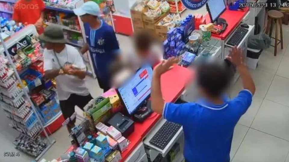 Três bandidos armados invadiram uma farmácia em Vila Nova de Colares, na Serra, e realizaram um assalto no último sábado (21). Durante o crime, os criminosos saquearam o caixa, levando também dinheiro, desodorantes e chocolates na presença de duas crianças que estavam fazendo compras no local. Toda a ação foi registrada por uma câmera de segurança.