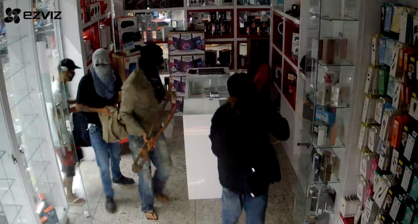 Vídeo da câmera de segurança do estabelecimento mostra quatro criminosos arrombando a porta da loja com uma ferramenta. Eles não aparentam portar arma de fogo e começam a furtar diversos objetos de alto valor, como caixas de som, celulares e até jogos.