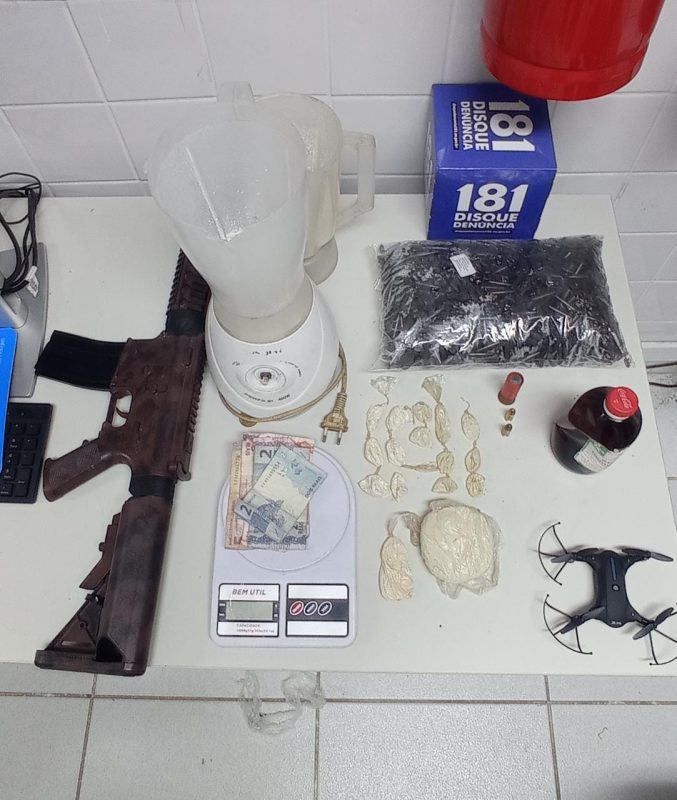 Além do drone, foram recolhidas uma balança de precisão, um liquidificador, um vidro de éter, 15 papelotes de cocaína, uma porção da mesma droga do tamanho de uma bola de sinuca, um pacote com pinos para embalo, uma réplica de fuzil, três munições e dinheiro.