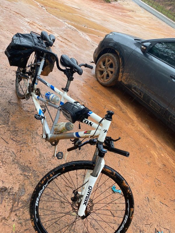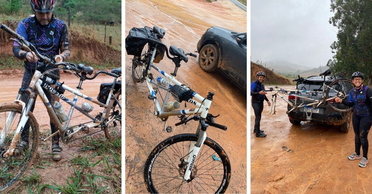 O casal da Serra que iria pedalar quase 400 quilômetros numa bicicleta de dois lugares de Colina de Laranjeiras a cidade de Entre Folhas, em Minas Gerais, teve a viagem interrompida por conta da chuva que provocou uma queda em meio a lama que danificou o guidão da bicicleta.