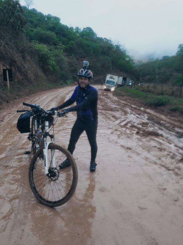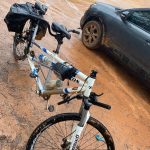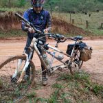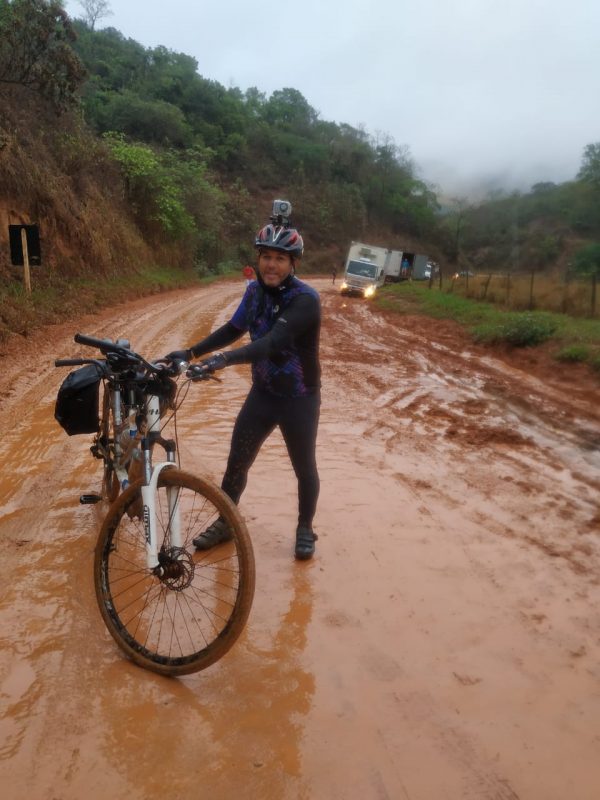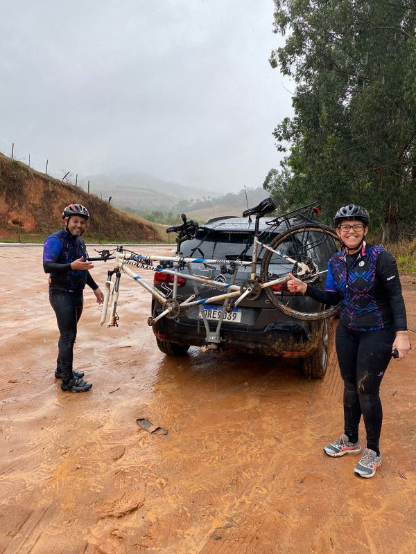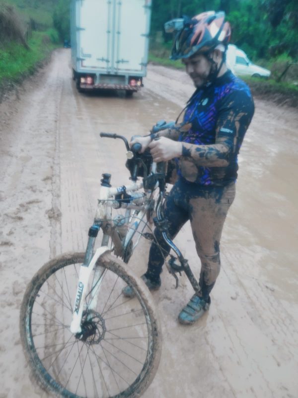 “Nós não conseguimos completar o percurso infelizmente. Em uma das quedas na lama, o canote do guidão quebrou e não conseguimos reposição. Tivemos que interromper a viagem e pedir resgate pro meu filho que foi nos buscar de carro”, disse Marly.]