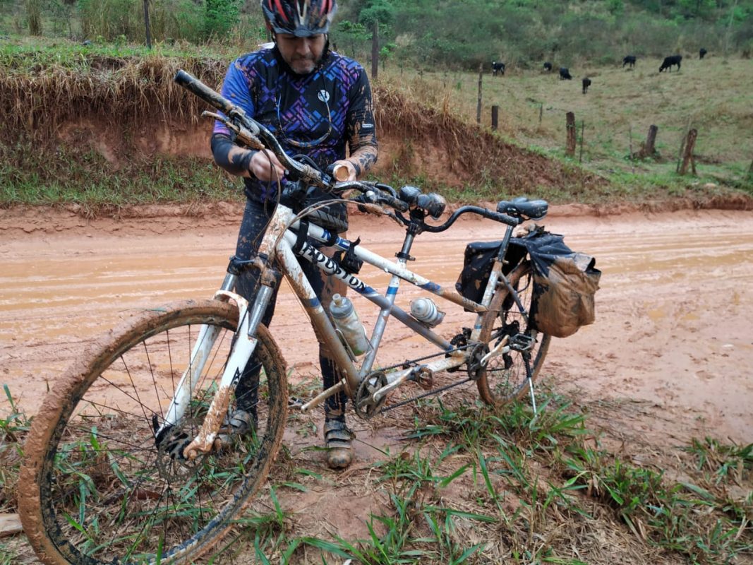 O trajeto dos ciclistas é feito por regiões que possuem calçamento e por trechos de estrada de chão. E foi justamente num pedaço de estrada de chão que o guidão da bicicleta quebrou e por dificuldade de reposição de peça, os ciclistas pediram resgate ao filho. Eles enfrentaram chuva, lama e frio.