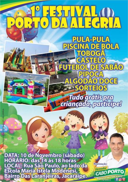 O Dia das Crianças foi no mês passado, mas em Jacaraípe neste sábado (10), os pequenos terão um dia especial. De forma gratuita, de 14h às 18h vai acontecer o 1º Festival Porto da Alegria, na Rua São Paulo, ao lado da Escola Maria Istela Modenesi, no Bairro das Laranjeiras, em Jacaraípe.