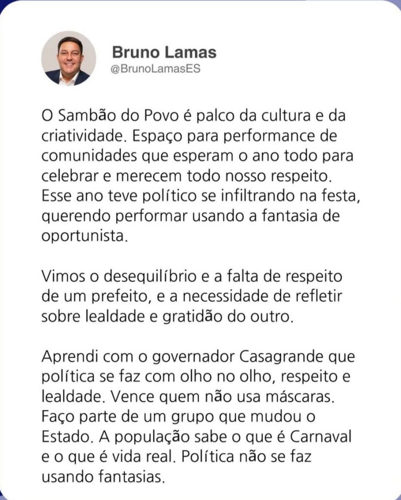 Com domicílio eleitoral na Serra e integrante do núcleo do governo Renato Casagrande, Bruno Lamas usou as redes sociais para fazer uma crítica ao uso do Carnaval como palco de articulação política, deixando clara sua leitura sobre o episódio que colocou, lado a lado, dois pré-candidatos ao Palácio Anchieta que até então ocupavam campos opostos.