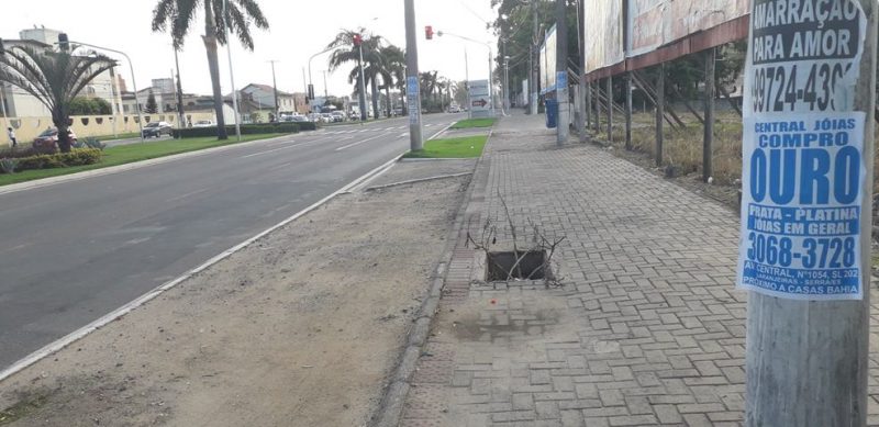 Um buraco em meio a calçada tem que sido alvo de reclamação de pedestres e ciclistas que utilizam a Avenida Eudes Scherrer de Souza, entre os bairros Parque Residencial Laranjeiras e Colina de Laranjeiras, na Serra.