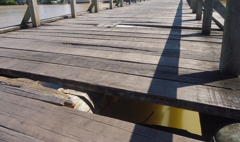 Muitos buracos. Este é o estado da Ponte Velha que fica entre Nova Almeida e Praia Grande. A reclamação é de moradores do balneário de Nova Almeida que temem que pessoas possam se machucar nas crateras formadas ao longo da ponte. Segundo eles, o problema acontece devido ao apodrecimento da madeira do piso.