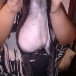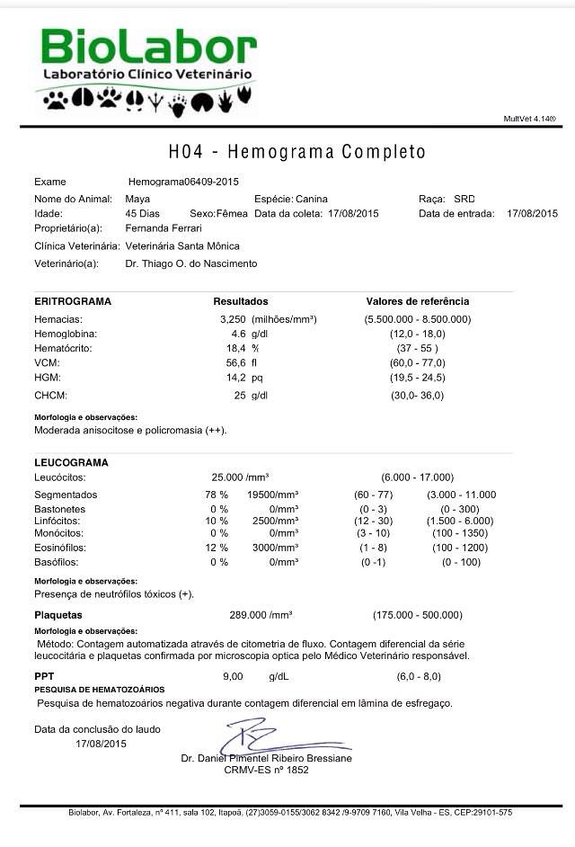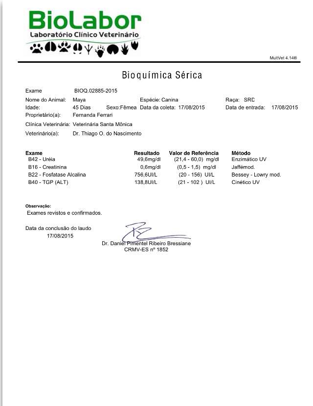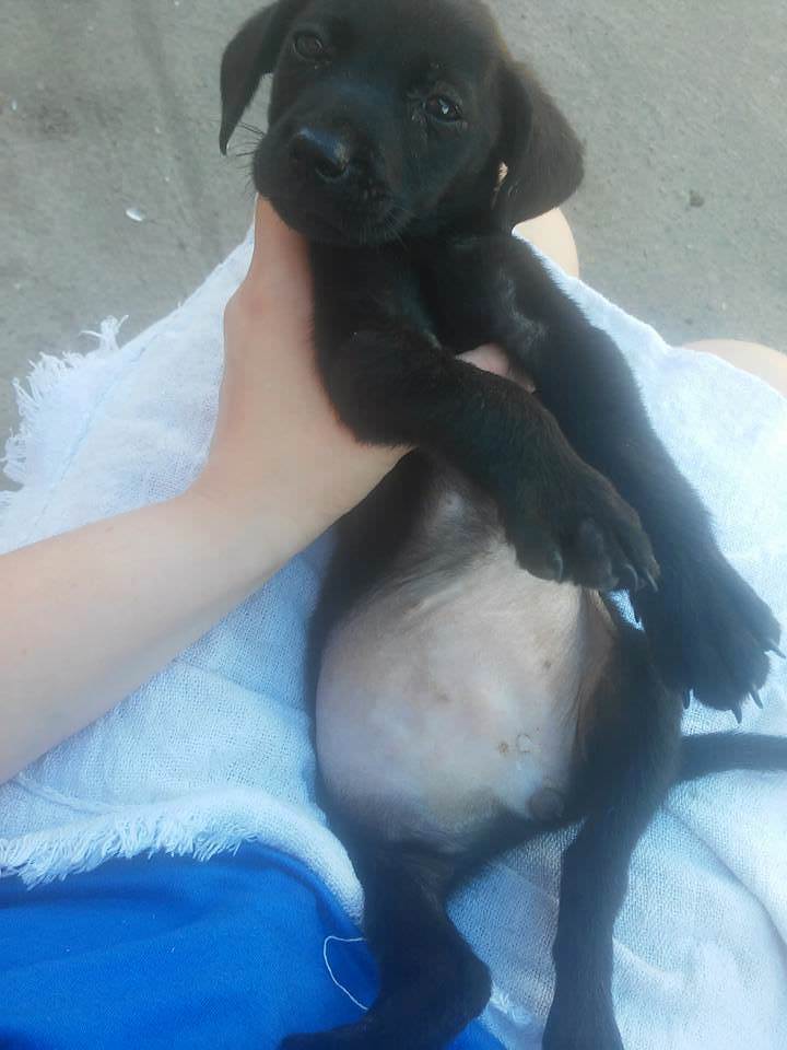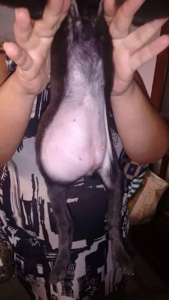 A filhotona já foi levada ao veterinário onde foi consultada, fez exames e passou por ultrassonografia abdominal. Foi detectado que o que a cachorra tem é uma hérnia.