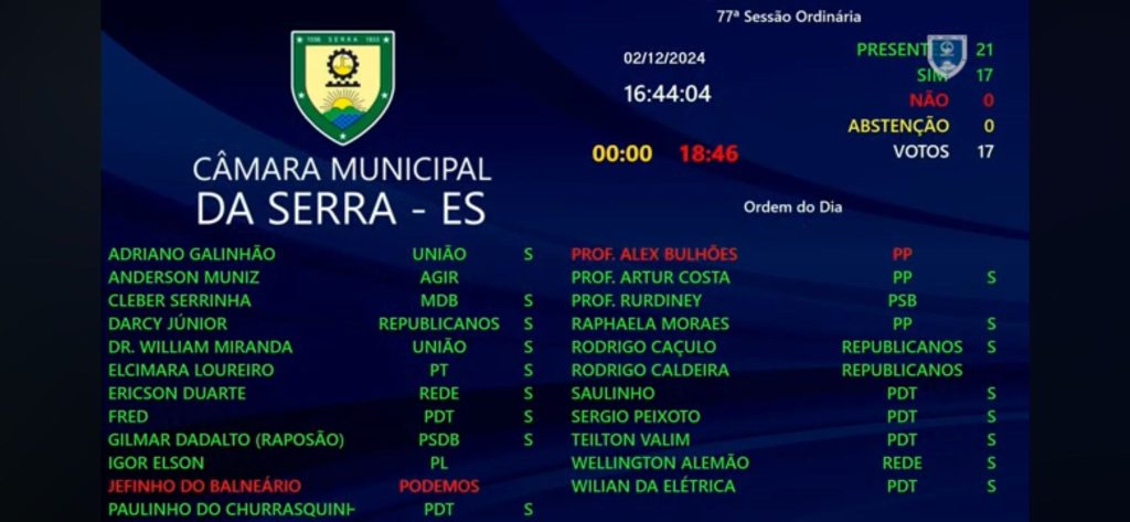 A Câmara da Serra aprovou durante a sessão ordinária desta segunda-feira (2) o Projeto de Lei 212/2024, que fixa os subsídios do prefeito, do vice-prefeito e dos secretários municipais para a legislatura 2025-2028. A proposta foi aprovada por unanimidade, com 17 votos.