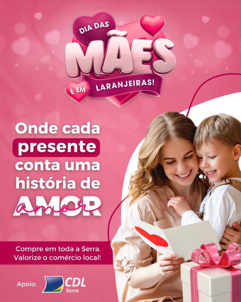 Neste Dia das Mães, a Câmara de Dirigentes Lojistas da Serra (CDL Serra) apoia a campanha institucional “Dia das Mães é em Laranjeiras. Onde cada presente conta uma história de amor”, com o objetivo de valorizar o comércio local e incentivar os moradores da cidade a comprarem na própria região.