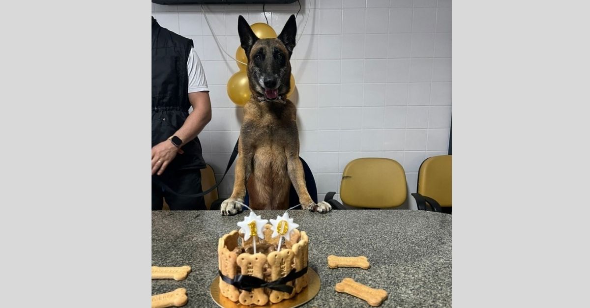 O cão policial Eudis, especialista em faro de armas e drogas da Polícia Militar do Espírito Santo, completou 10 anos e ganhou bolo para comemorar a data.