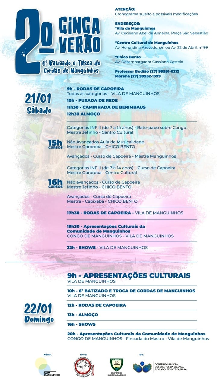 O balneário de Manguinhos será palco do II Ginga Verão – evento de capoeira que reúne capoeiristas de todo o Brasil. Na programação vai ter curso sobre o tema, rodas de capoeira e apresentações culturais.