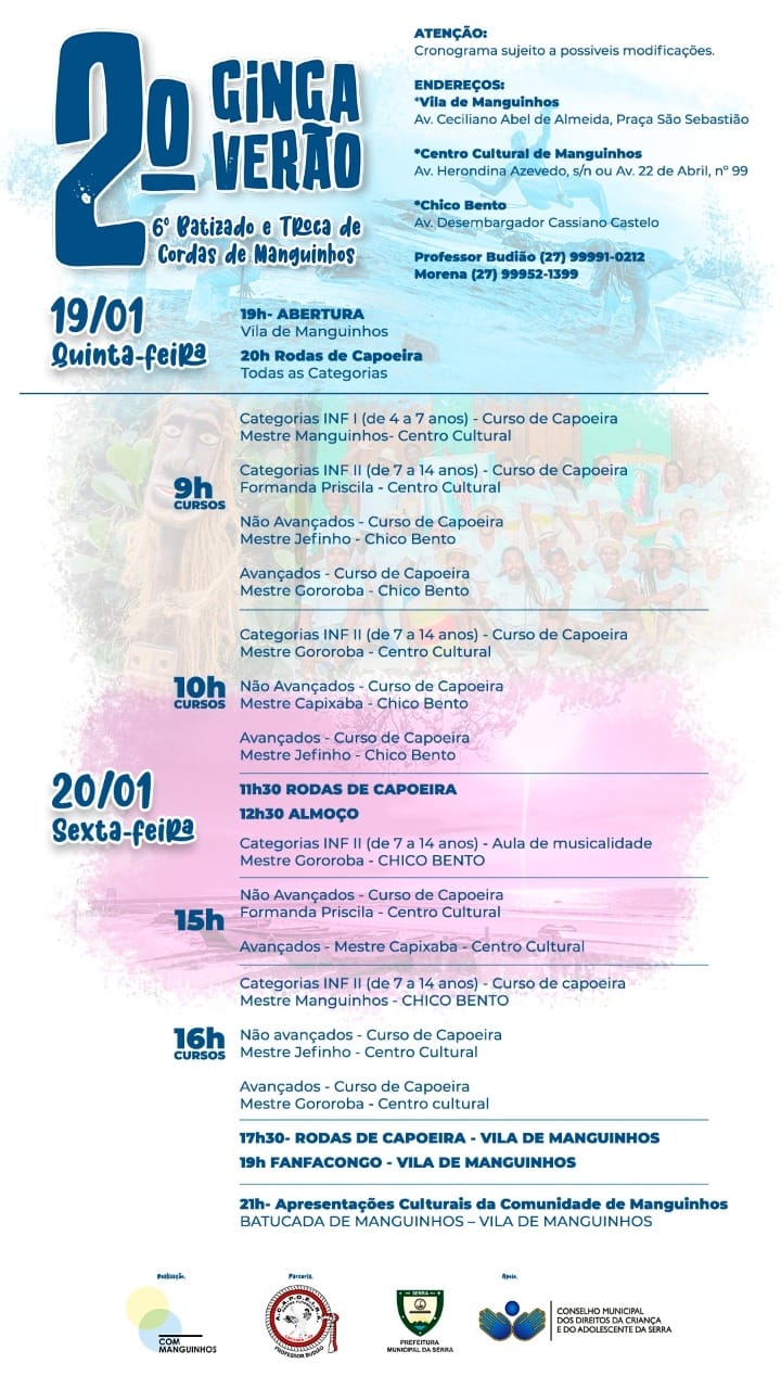 O evento marca também o sexto batizado e troca de cordas de Manguinhos. Estão confirmados no encontro nomes como dos mestres capoeiristas: Mestre Manguinhos, formanda Priscila, Mestre Jefinho, Mestre Gororoba e Mestre Capixaba.