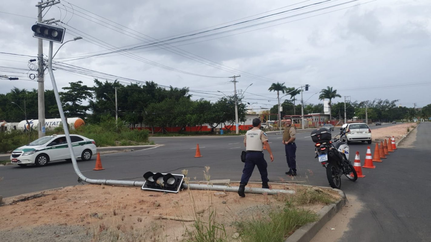 Isto porque uma carreta se chocou contra a coluna do poste projetando o semáforo para o canteiro central da via. O acidente aconteceu sentido rotatória do Dório Silva para o posto Ipiranga.