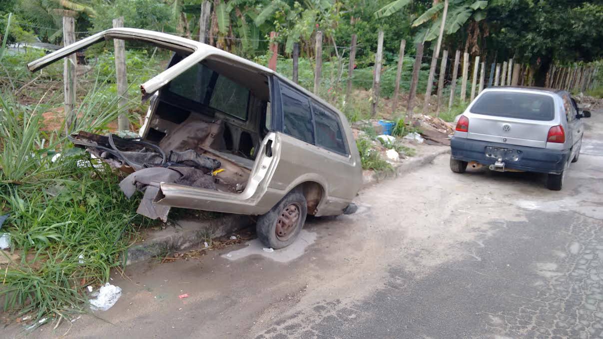 Pela metade. Assim está um carro que foi abandonado na rua Amazonas em José de Anchieta II. A carcaça do veículo está incomodando moradores do bairro, já que segundo populares, crianças estão usando o local como esconderijo para brincadeiras.