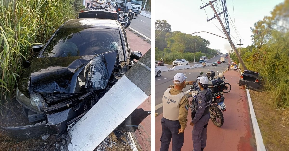Cones foram colocados na via, uma vez que corre o risco de o poste cair na rodovia, na faixa da direita. “O receio de retirar o veículo do local e o poste quebrar de uma vez. É necessário a retirada do poste para depois fazer a retirada do veículo”, registrou o agente Edimar, o primeiro a chegar no local do acidente.