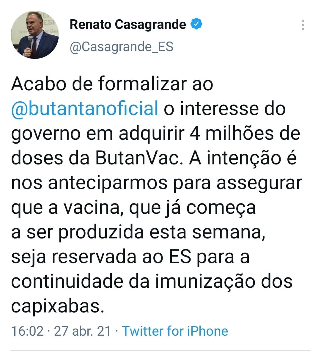 O Instituto Butantan começou a produzir na última quarta (28) a primeira vacina nacional contra a Covid-19, a Butanvac. E o governador do Espírito Santo, Renato Casagrande, publicou em suas redes sociais um dia antes na terça (27) que formalizou o interesse junto ao Governo de São Paulo em adquirir 4 milhões de doses do imunizante para serem usadas nos capixabas.