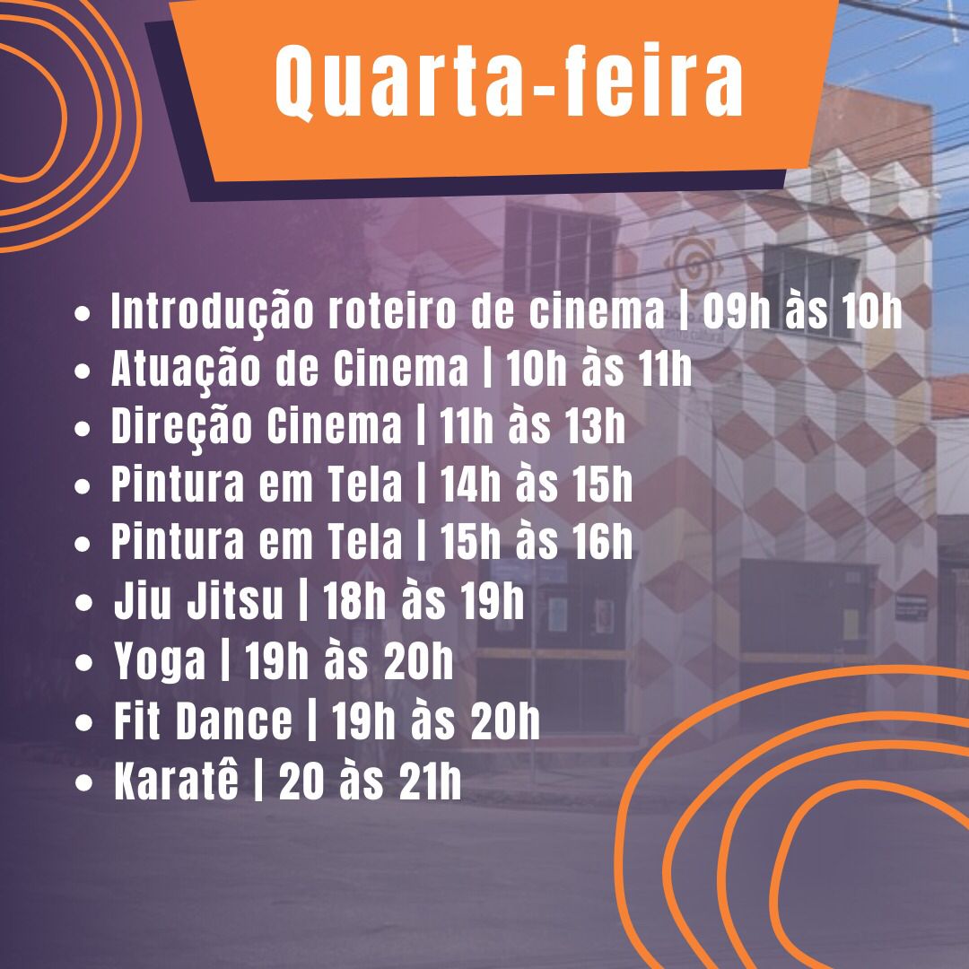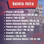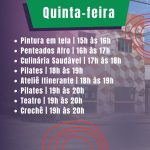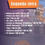 O interessado poderá escolher aprender pintura em tela, zine, criação de mandala terapêutica, jiu jitsu, karatê, yoga, culinária saudável, fit dance, pilates, ballet clássico – baby, ballet clássico – infantil de 07 a 11 anos, ballet clássico – teen de 12 a 17 anos e ballet clássico – adulto – maiores de 18 anos.