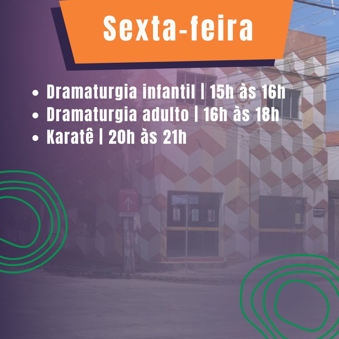 Também há opção de fazer oficina de penteados afro, crochê, desenho, ateliê itinerante, teatro, introdução roteiro de cinema, atuação para cinema, direção cinema, xadrez, gravura, dramaturgia infantil e dramaturgia adulto.