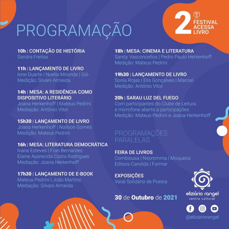 Neste sábado (30), o Centro Cultural Eliziário Rangel, em São Diogo, na Serra, vai promover o 2º Festival Acessa Livro que contará com 12 horas de programação gratuita aberta para o público em geral. Vai ter sarau, contação de história, mesas de debate e lançamento de livros. O primeiro Festival Acessa Livro aconteceu em 2020 de modo virtual.