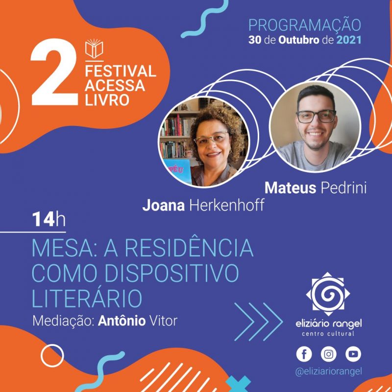 Às 14 horas, tem mesa de debate, com o tema ‘A Residência como dispositivo literário’ com mediação de Antônio Vitor e participação de Mateus Pedrini e Joana Herkenhof.
