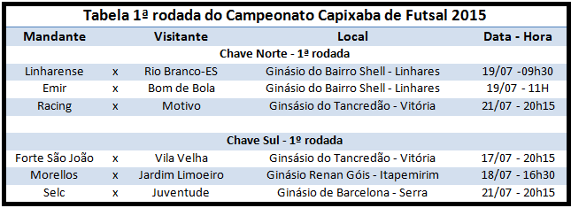 A primeira rodada acontece nos dias 17, 18, 19 e 21 deste mês. Os times serranos começam a jogar no sábado (18), o Jardim Limoeiro visita o Morellos em Itapemirim no Ginásio Renan Góis, às 16h30. No domingo (19), a vez é do Bom de Bola, que vai até Linhares enfrentar o Emir, no ginásio do Bairro Shell, às 11h.